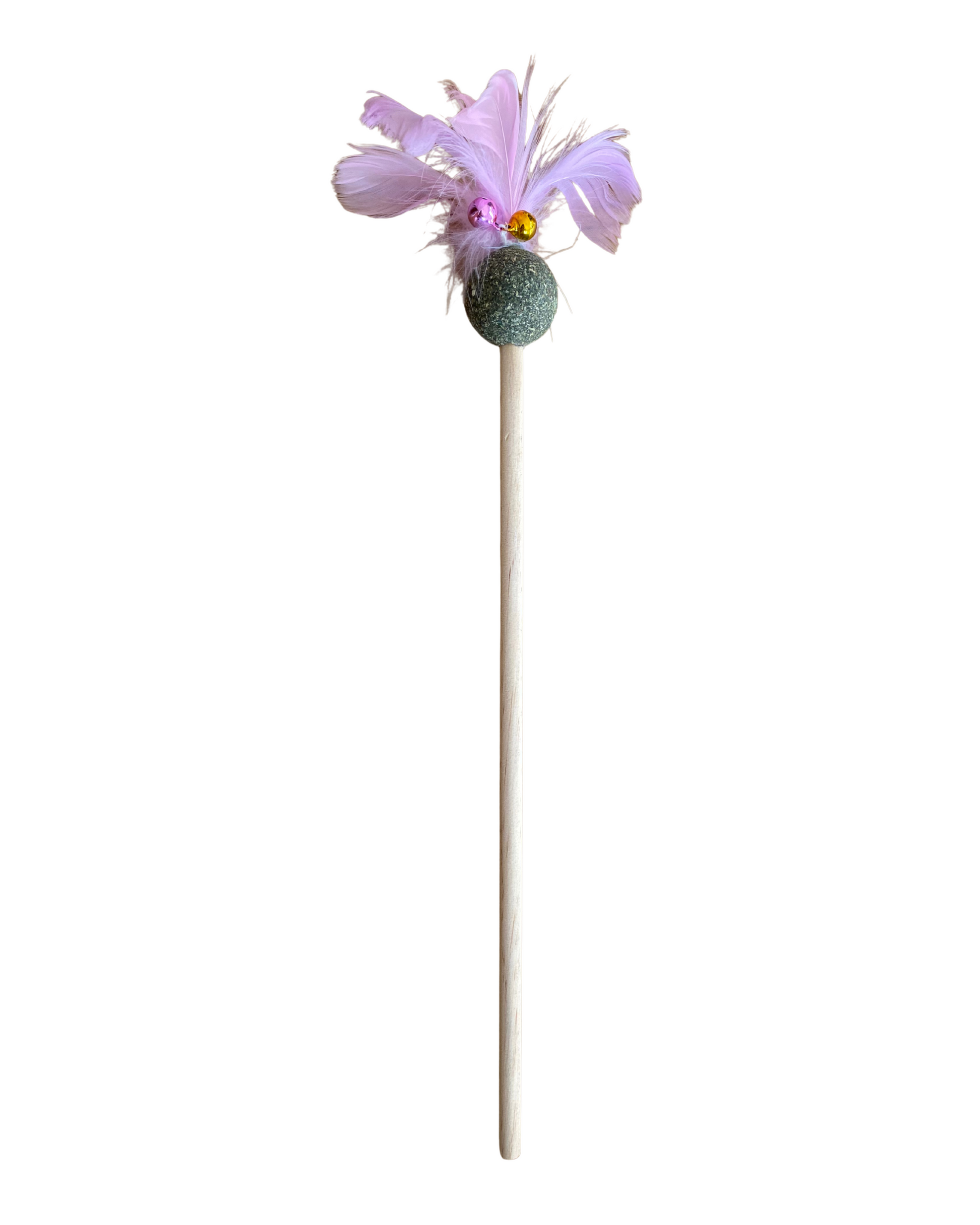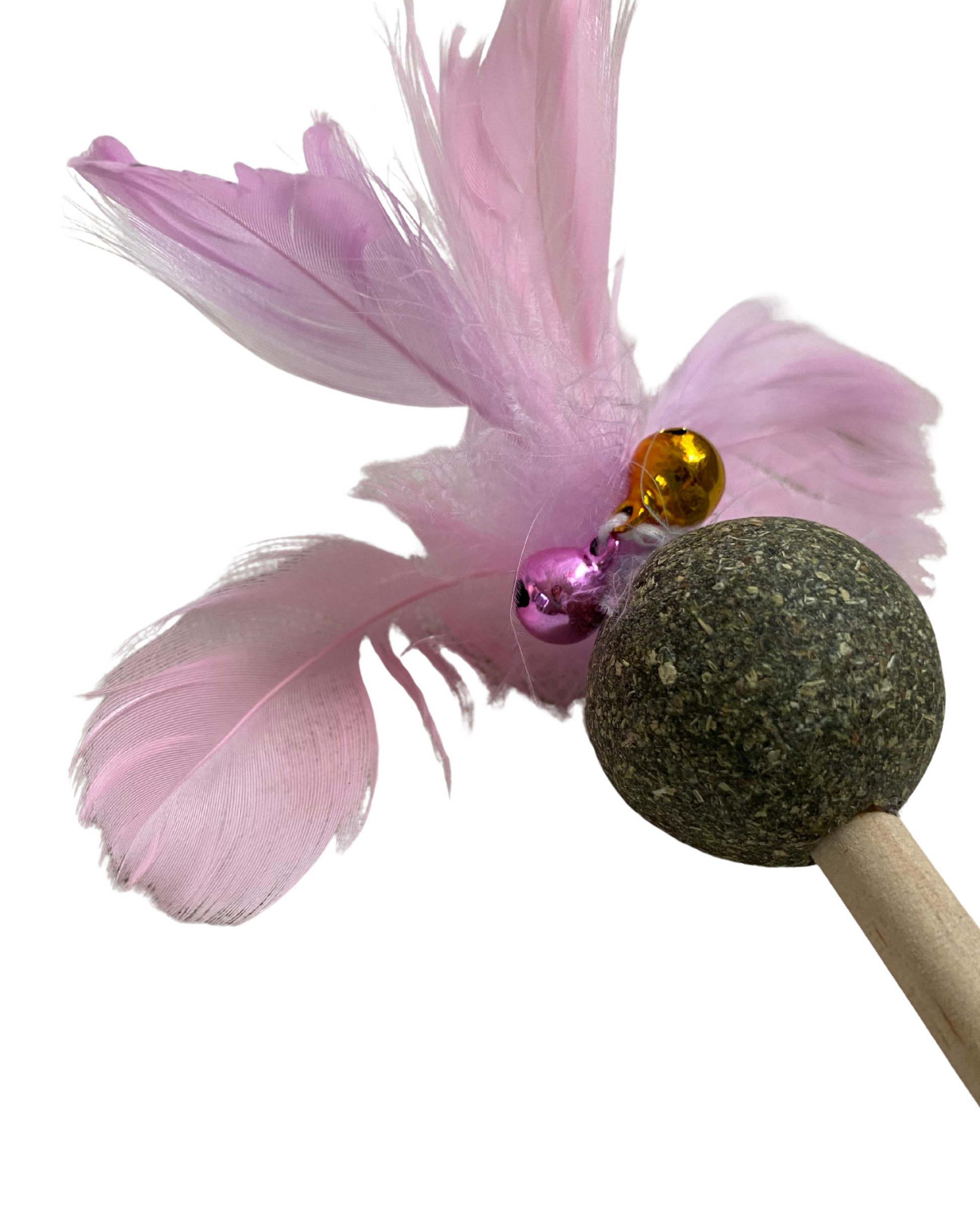 Una herramienta de estimulación felina elaborada con varilla de madera, bolita de catnip natural concentrado y plumas con cascabeles metálicos.